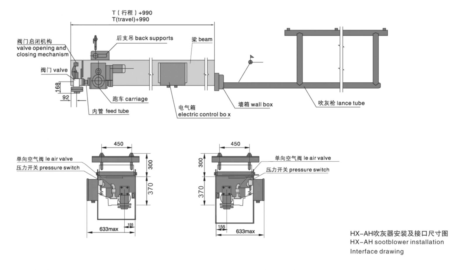 HX-AH type soot blower is mainly composed of sports car, poppet valve, beam body, wall box, inner pipe, soot blowing gun and nozzle, electrical box and control, etc.