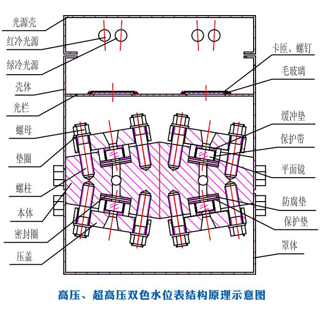 五窗、七窗、九窗水位表觀察孔在表體的兩條直線上,通過將觀測孔交錯組合消除了中間盲區(qū)。由光源發(fā)出的光通過紅、綠濾色鏡片,射向水位表體液腔,在表面內(nèi)汽相部分,紅光射向正前方,而綠光斜射到壁上被吸收。而在表體內(nèi)液相部分,由于水的折射使綠光射向正前方,而紅光斜射到壁上被吸收。因此在正前方觀測將獲得汽紅、水綠、汽滿全紅、水滿全綠的顯示效果。